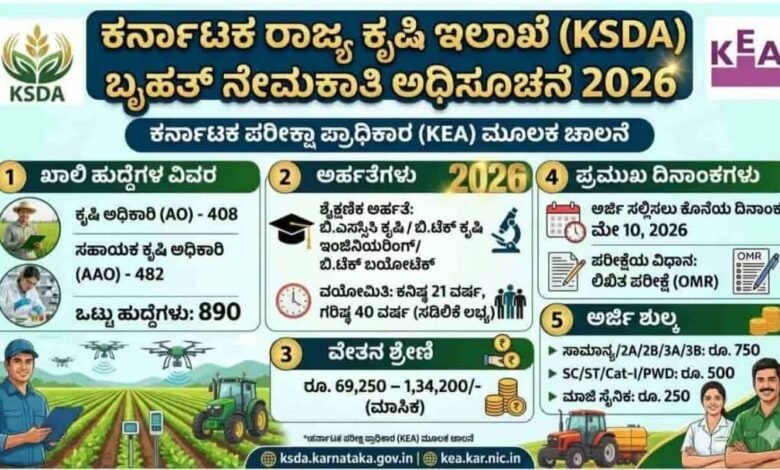ಬೆಂಗಳೂರು: ಕರ್ನಾಟಕ ಕೃಷಿ ಇಲಾಖೆಯಲ್ಲಿ (KSDA) ಖಾಲಿ ಇರುವ ಬೃಹತ್ ಸಂಖ್ಯೆಯ ಹುದ್ದೆಗಳನ್ನು ಭರ್ತಿ ಮಾಡಲು ಕರ್ನಾಟಕ ಪರೀಕ್ಷಾ ಪ್ರಾಧಿಕಾರವು (KEA) ಅಧಿಕೃತ ಅಧಿಸೂಚನೆ ಹೊರಡಿಸಿದೆ. ಒಟ್ಟು 890 ಕೃಷಿ ಅಧಿಕಾರಿ (AO) ಮತ್ತು ಸಹಾಯಕ ಕೃಷಿ ಅಧಿಕಾರಿ (AAO) ಹುದ್ದೆಗಳಿಗೆ ಅರ್ಹ ಅಭ್ಯರ್ಥಿಗಳಿಂದ ಅರ್ಜಿ ಆಹ್ವಾನಿಸಲಾಗಿದ್ದು, ಮೇ 10 ಅರ್ಜಿ ಸಲ್ಲಿಸಲು ಕೊನೆಯ ದಿನವಾಗಿದೆ.